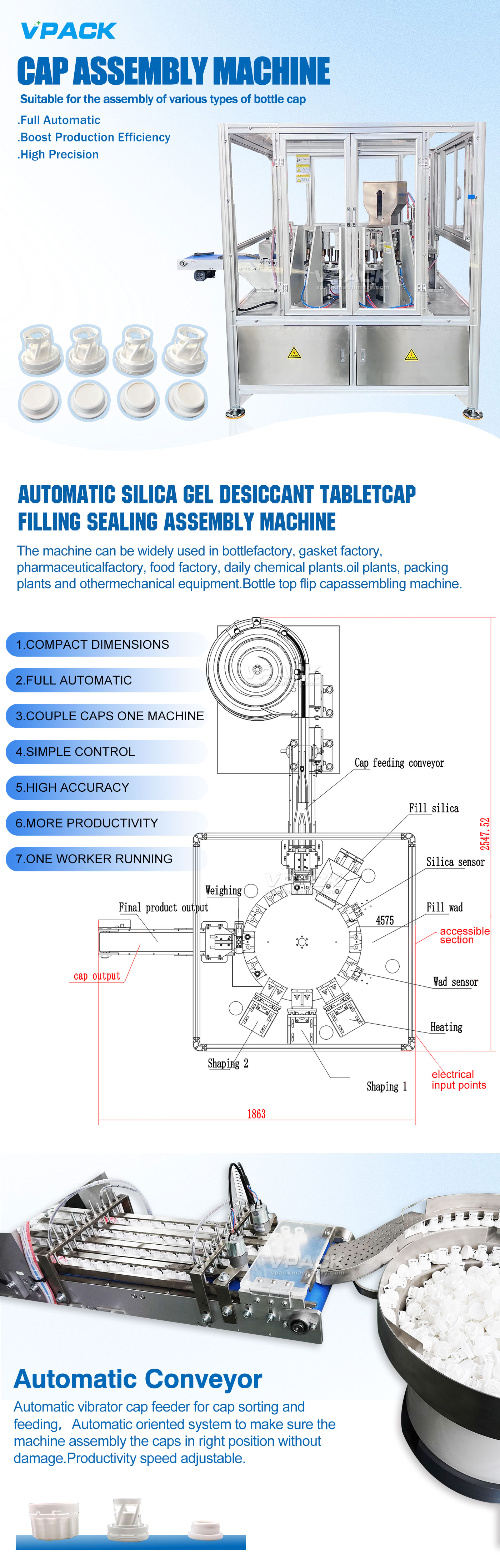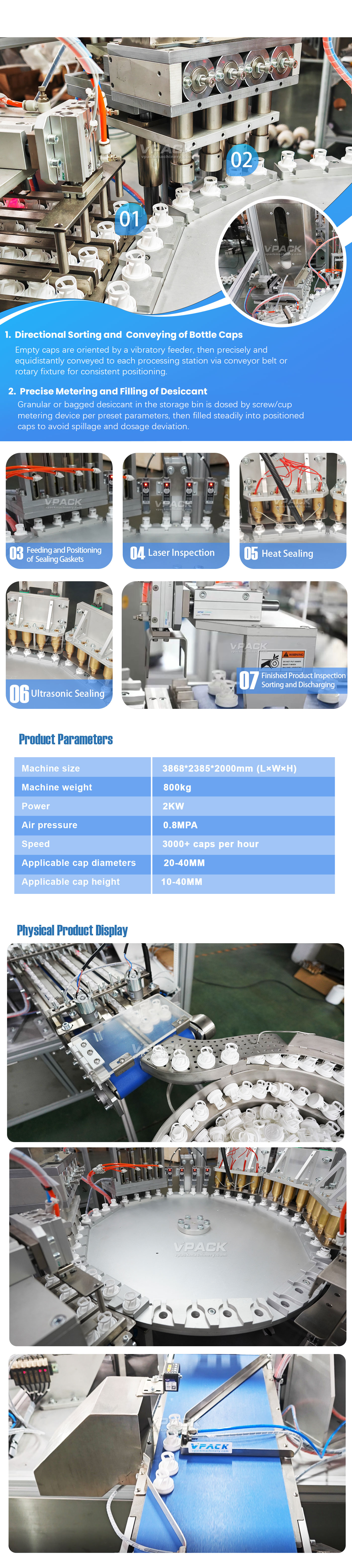 It is used to accurately fill desiccants (such as silica gel beads, molecular sieves, etc.) inside various bottle caps, and then automatically complete the sealing process, enabling the caps to have moisture-proof functions. It is widely applied in the packaging fields requiring moisture protection, including pharmaceuticals, food, health products, electronic products, etc.